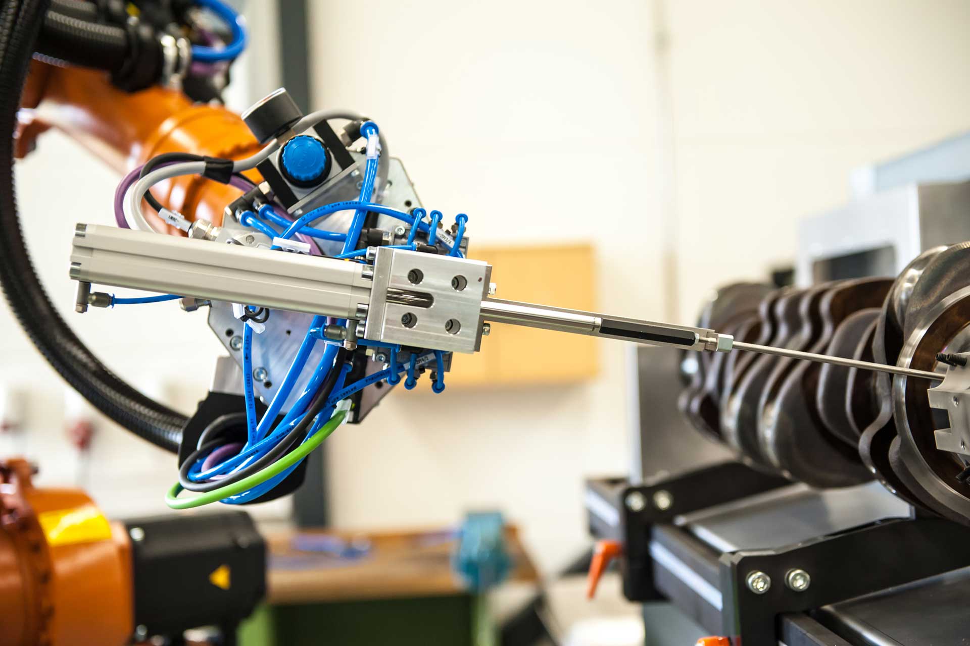 Die Kurbelwelle wird auf einen Drehtisch gespannt. Der Drehtisch hat zwei Aufnahmeplätze, einen auf der Roboterseite, den anderen auf der Ladeseite. Jede Aufnahme ist durch eine NC-Achse (7. und 8. Roboterachse) in die Robotersteuerung eingebunden. Vor dem Start vermisst der Roboter mit Hilfe eines Sensors die Drehlage. Der Roboter bedient sich nun am Werkzeugbahnhof, um die Kurbelwelle mit dem entsprechenden Entgratwerkzeug zu entgraten.