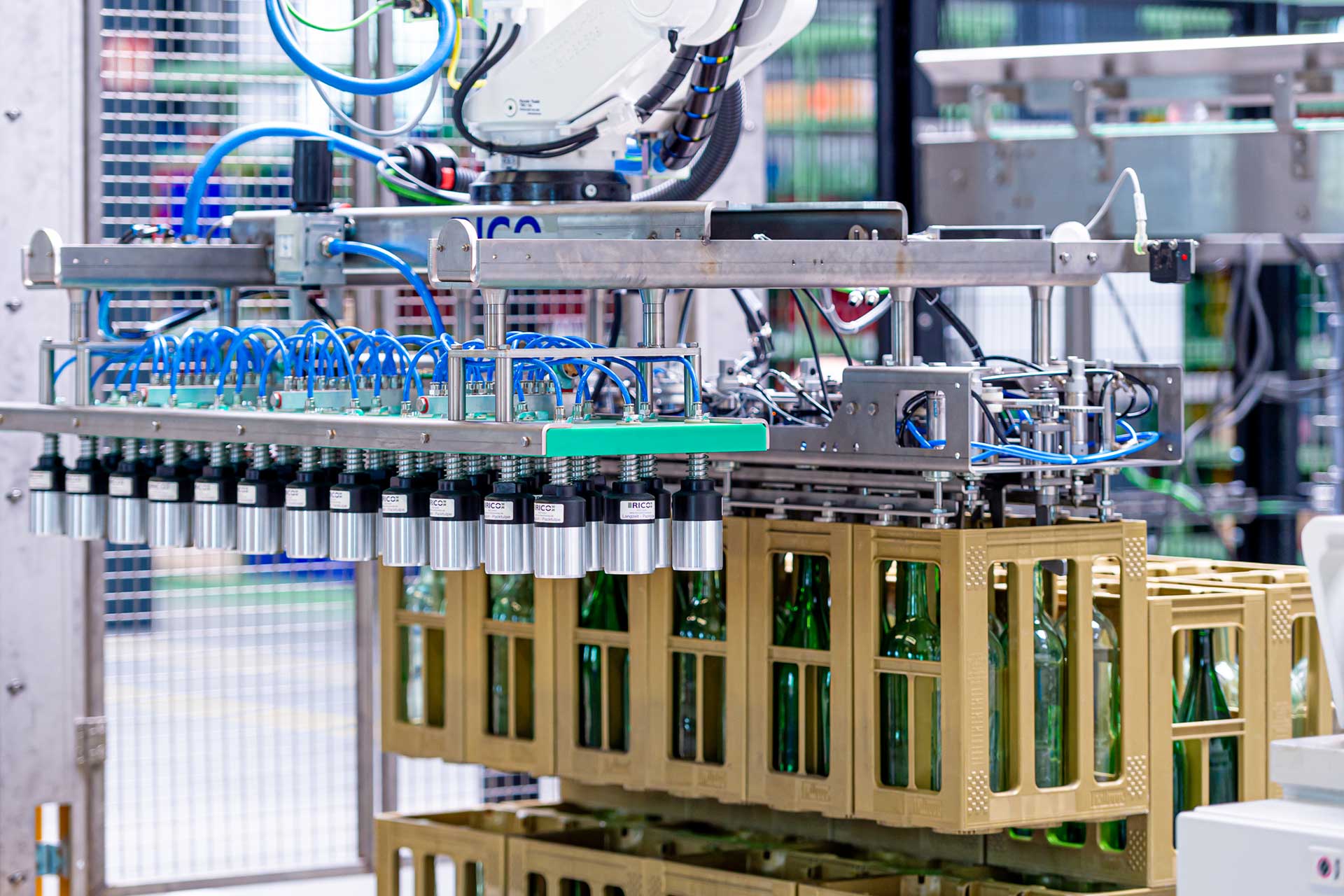 Dieser robotergeführte Doppelgreifer packt sowohl Mehrweg-Flaschen als auch 6er-Kästen.