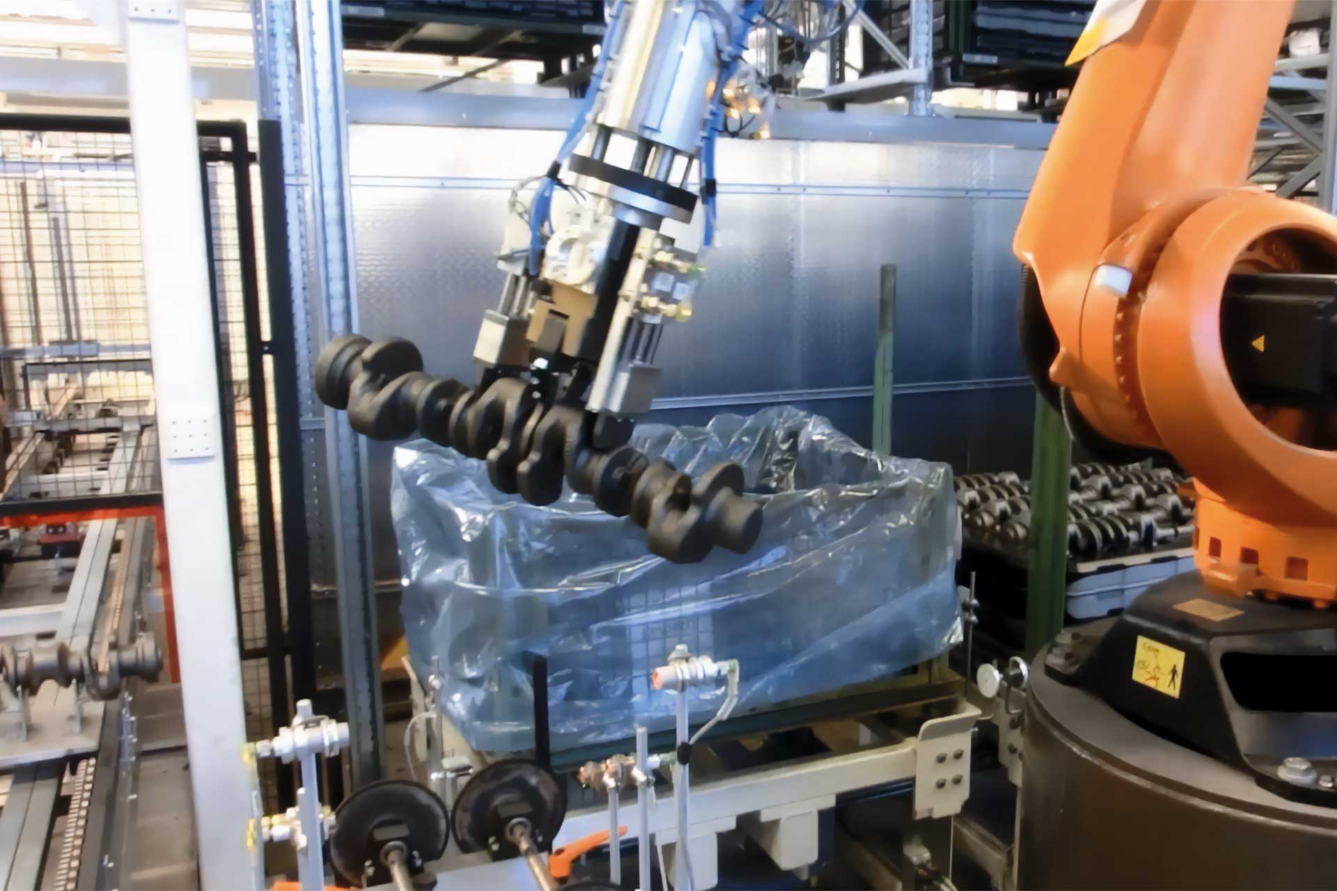 Anwendungsbeispiel: Kurbelwellen werden aus einer Gitterbox entnommen.