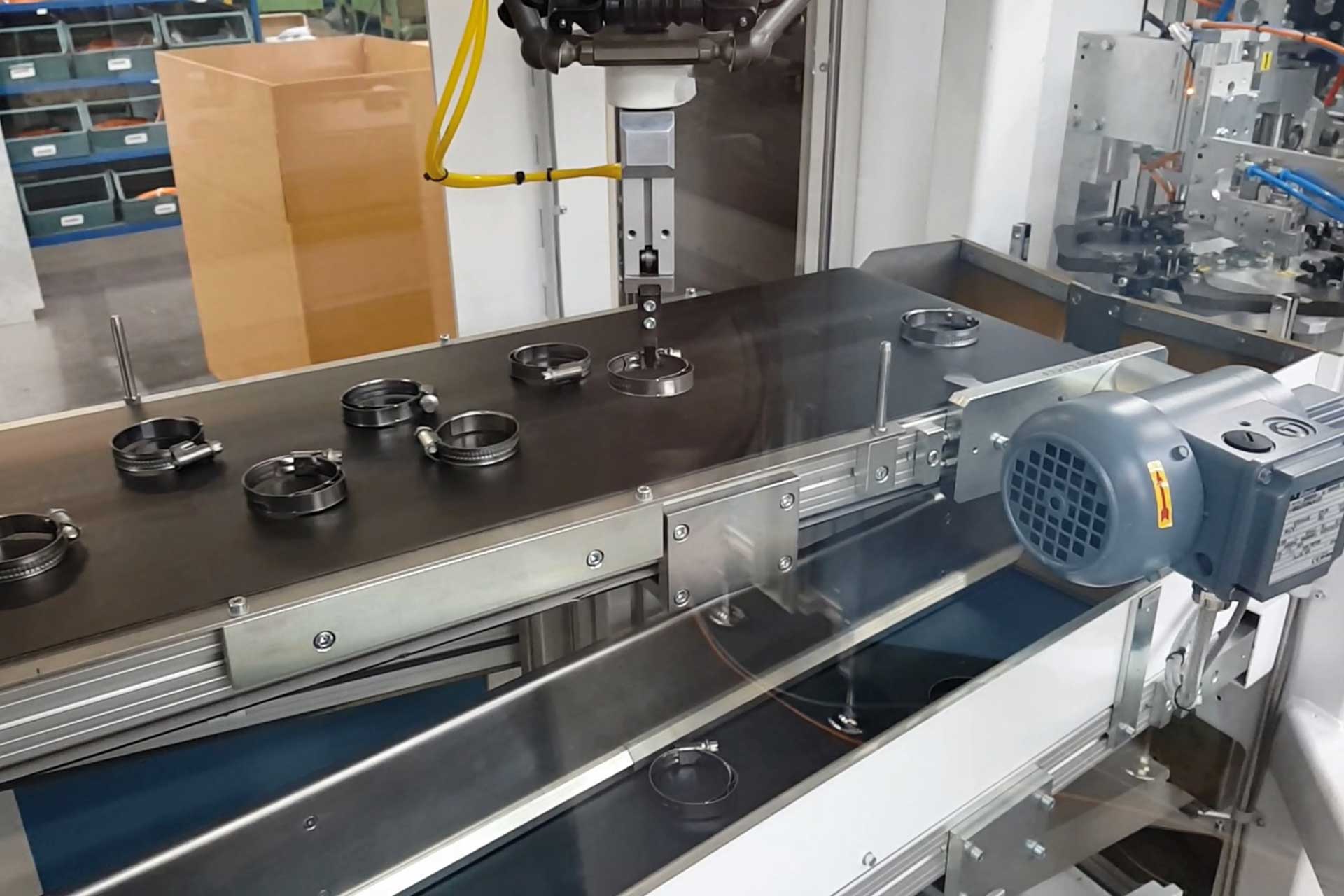 Rohrschellen laufen auf einem Band grob vereinzelt in die Roboterzelle ein. Mit einer 2D-Kamera werden – während sich das Band weiterbewegt – Drehlage und Greifposition sowie die Bauchlage oder Rückenlage ermittelt. Diese Daten werden dann dem Roboter übermittelt und der Roboter greift sich während der Bandbewegung die Bauteile und legt diese entsprechend der Bauch- oder Rückenlage in einen Takttisch ein. Dort findet dann die Endmontage der Bauteile statt.